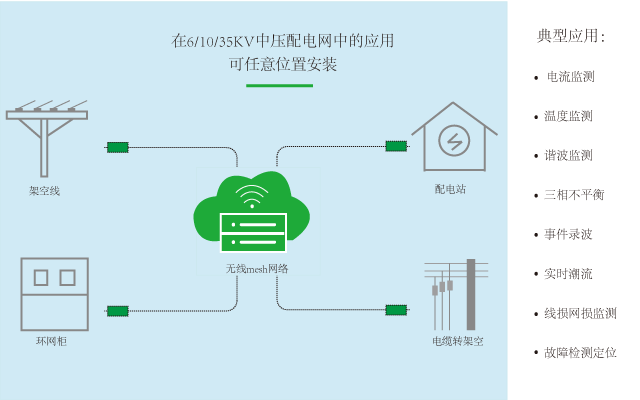 实时测量并周期上报安装地点的电压、电流、功率及温度等,并可自动报警提示电流、温度越限等事件;